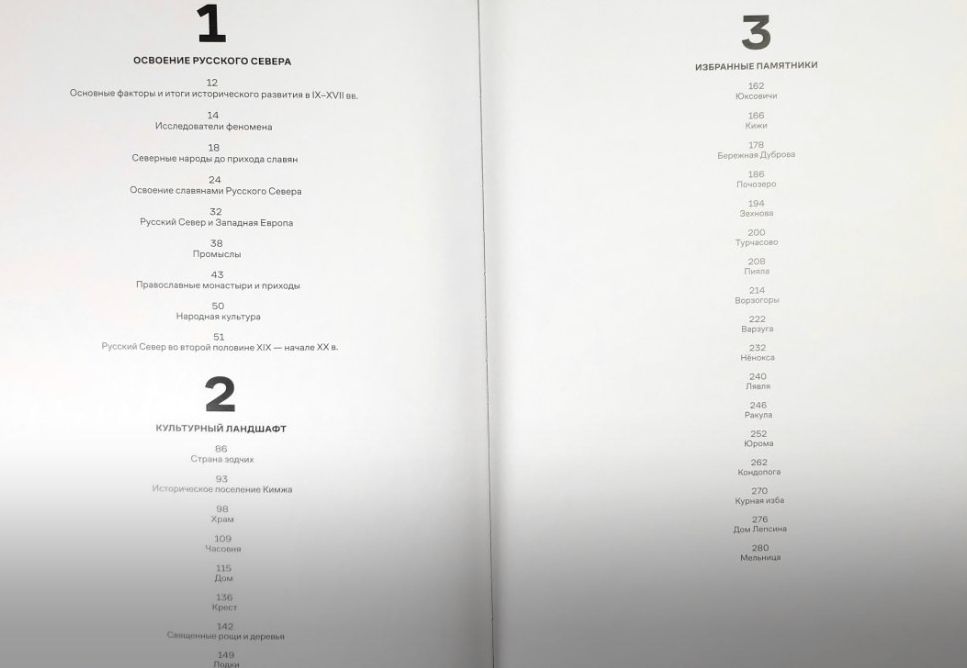 Структура издания состоит из трех глав: «Освоение Русского Севера» (автор — доктор исторических наук Александр Михайлович Пашков, Петрозаводский госуниверситет), «Культурный ландшафт» (автор — доктор культурологии, академик Академии архитектурного наследия Анна Борисовна Пермиловская, ФИЦКИА УрО РАН, Архангельск), «Избранные памятники» (автор — историк архитектуры, главный специалист-искусствовед «НИиПИ Спецреставрация» Татьяна Сергеевна Ковалевская, Санкт-Петербург).